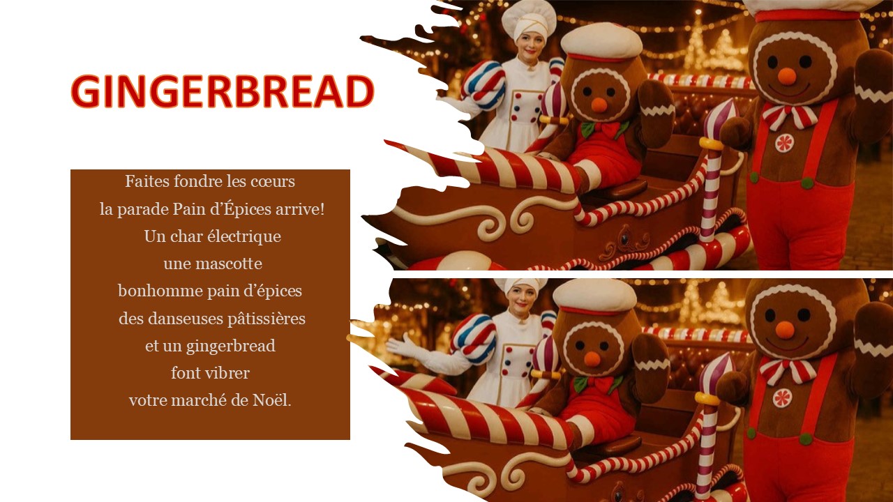 Sous l’enchantement de la saison des fêtes, un spectacle féérique prend forme avec une superbe procession de personnages gonflables, comportant des ours espiègles, des rennes majestueux, un bonhomme de neige joyeux et un panda malicieux, tous dirigés par la délicate et envoûtante Maestria